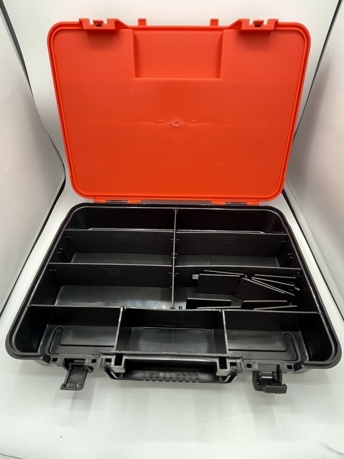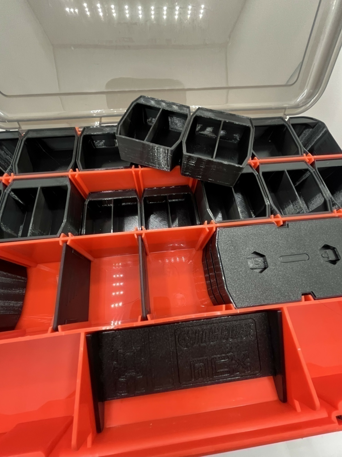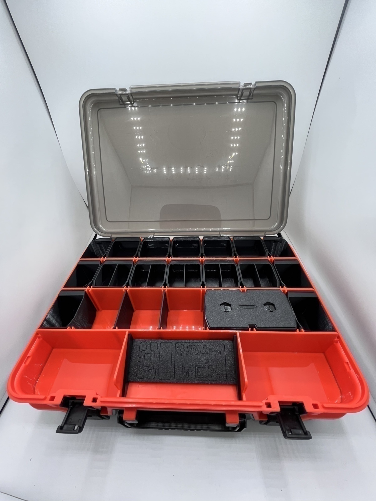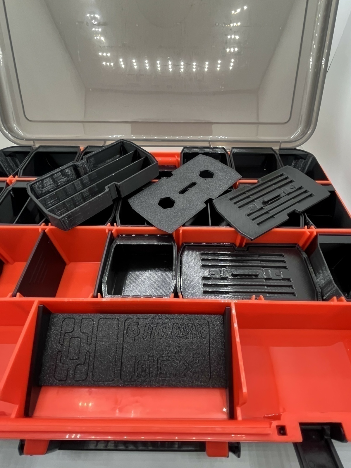 La valigetta presenta uno scomparto superiore con coperchio trasparente, già provvisto di scomparti progettati e realizzati in stampa 3D in PETG nero per ospitare: